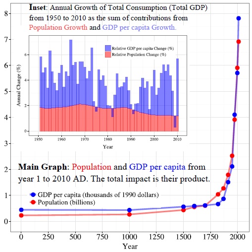 Since 1900 human numbers have quadrupled. At the same time, our use of resources per person has increased tenfold compared with those that sustained our ancestors just four generations ago. Thus, humanity now uses and releases 40 times more stuff to live –unimaginably more – than we did in 1900.