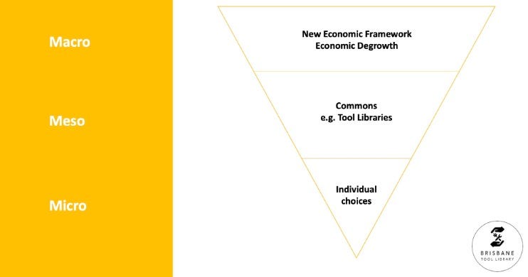 Based on principles and practices of resource use reduction, sharing, conviviality, solidarity, and mutual aid, the Brisbane Tool Library can be considered a small-scale laboratory for a reorientation of society towards degrowth.