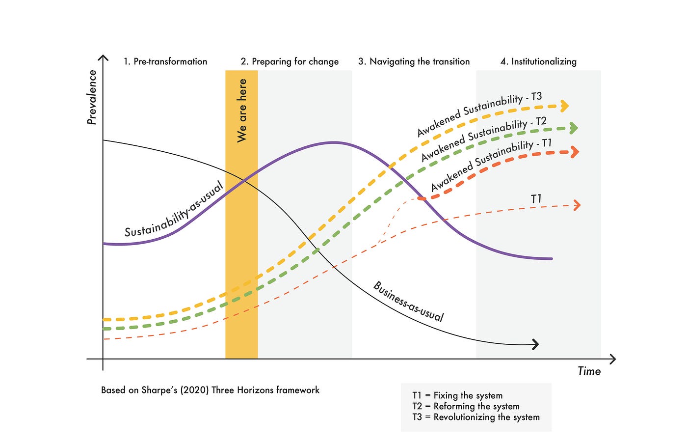 The ‘battle’ between the three pathways on how the transformation to a new state, which I describe as awakened sustainability, will unfold is not necessarily a winner-takes-it-all situation. In my book, I suggest these pathways could have symbiotic relationships, where they interact with and affect one another, potentially reducing some of the differences and tensions between them. This is why I believe it is important to offer a viable picture of what a degrowth business model could look like — the more feasible and compelling it is perceived to be on a business level, the more dominant role degrowth can play in shaping the transformation process.