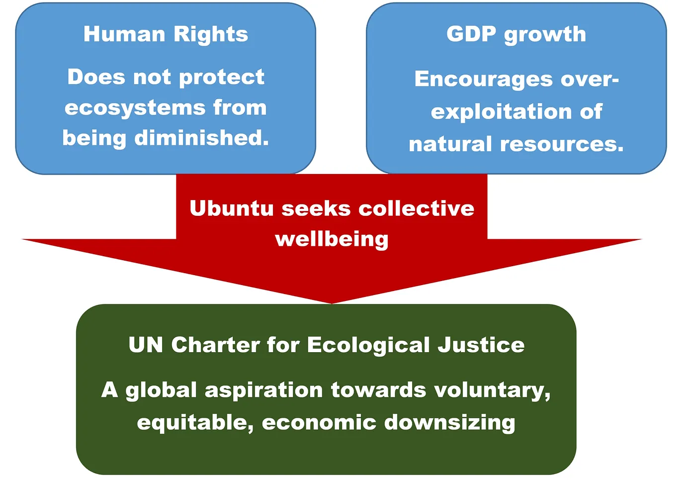 The ‘lifeboat’ described above is expressed formally in the UN Charter for Ecological Justice; this concept is designed to redress the flaw in our Human Rights and our prevailing economic model which both ignore the need to operate within the biocapacity of Earth. The Charter is designed to inspire the longing for economic downsizing into the human mindset. It will enable the fledging Degrowth movement to evolve up to a new level of ambition and vision.