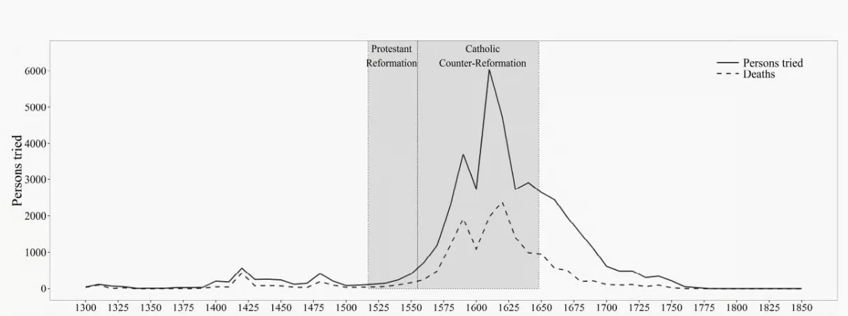 Remarkably, witch hunting faded out by itself. There was no “Witch Burning Rebellion,” no “Witch Liberation Movement.” Even during the decline phase, there are no records of anybody explicitly condemning witch hunting. For nearly a century after executions stopped, condemning the madness remained outside the Overton Window of the time. The “Illuminists” of the 18th century spoke scathingly about all superstitions, but that was when the killings were already almost over, and they never singled out witch burning as an especially odious crime.