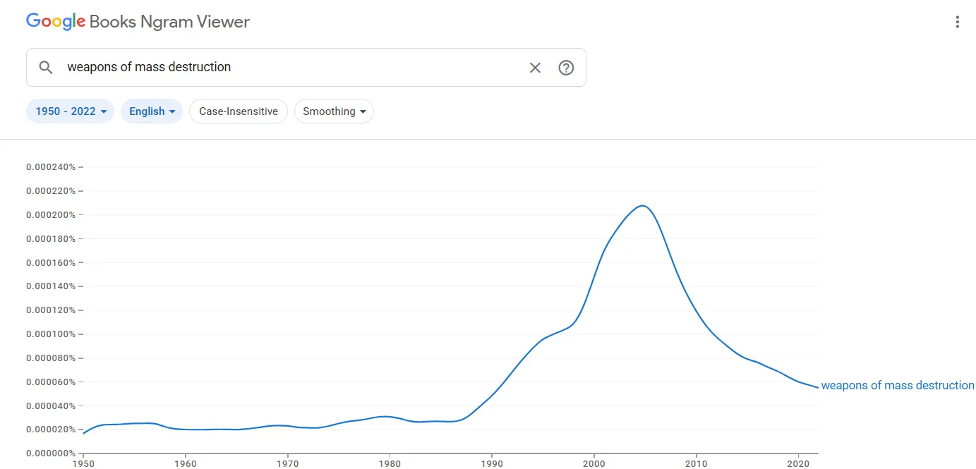 The London bacterial epidemic lasted less than one year. The memetic epidemic of witch hunting in Europe lasted much longer, about two centuries in Europe, but the shape of the curve was the same. In our times, people have been infected with various evil memes, a typical example is that of Iraq being supposed to possess “weapons of mass destruction,” and hence deserving to be destroyed by bombing. The shape of the memetic infection is the same, in this case, seen in terms of the number of mentions of the concept in books, according to Google Ngrams.