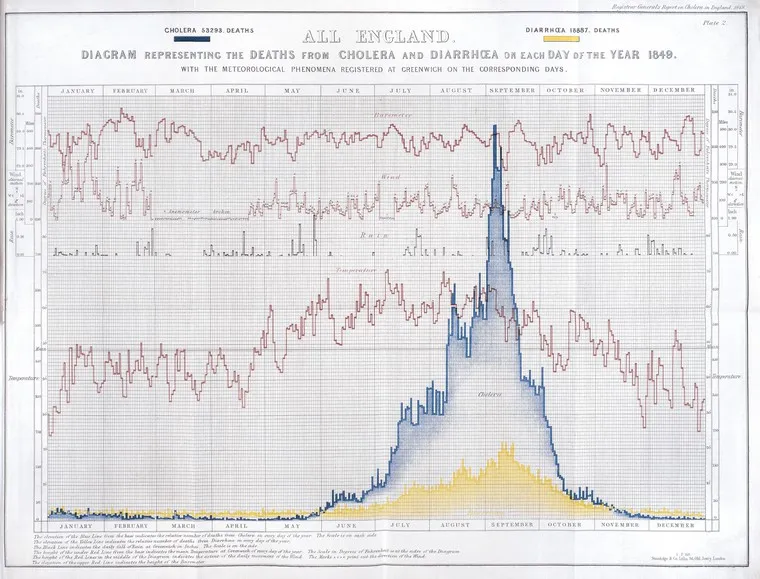 Memes and genes follow similar patterns of growth and decline. You can see here a classic case of this kind of curve in the real world, the cholera epidemic in London of 1849. You can find the equations of the model that generate these curves in my book.