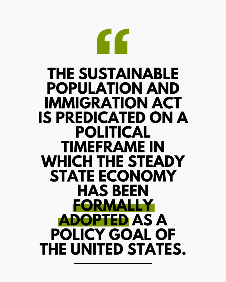 Section 2 is in many ways the most critical component. It comprises the findings and declarations of Congress, in which Congress expresses its paradigm shift from the goal of economic growth to the goal of a steady state economy. In short order, Congress finds that stabilizing population is an essential aspect of a steady state economy. Congress then declares that (among other things) it is the policy of the United States to “allow for immigration levels, that, considering fertility, mortality, and emigration rates, result in a stabilized U.S. population.”