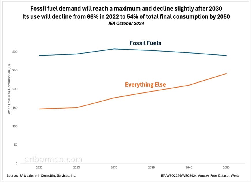 Figure 2. Fossil fuel demand will reach a maximum and decline slightly after 2030. Its use will decline from 66% in 2022 to 54% of total final consumption by 2050. Source: IEA & Labyrinth Consulting Services, Inc. Click on the image to enlarge.
