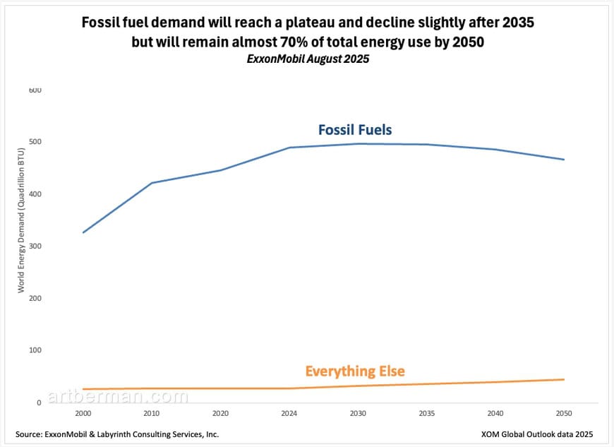 ExxonMobil’s Global Outlook 2025 paints a grim picture for those who believe in a real transition to renewables. There’s no “peak demand” for fossil fuels—only a plateau, with a slight decline after 2035, but fossil energy still makes up nearly 70% of the energy mix in 2050 (Figure 1).