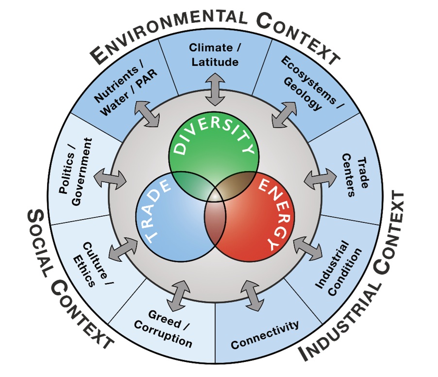 Figure 3.1, page 59 of the book. The structure of an economy consists of its foundational components—diversity, energy, and trade—and the external forces interacting with them. A few common external forces are represented in the chasing arrows. Reproduced with permission. Click on the image to enlarge.