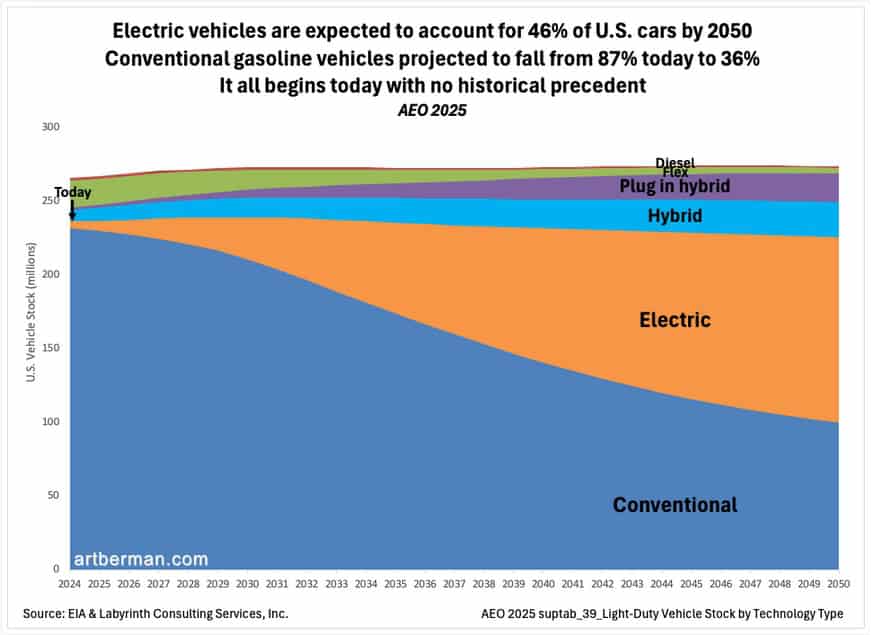 Figure 2. Electric vehicles are expected to account for 46% of U.S. cars by 2050. Conventional gasoline vehicles projected to fall from 87% today to 36%. It all begins today with no historical precedent. Source: EIA & Labyrinth Consulting Services, Inc. Click on the image to enlarge.