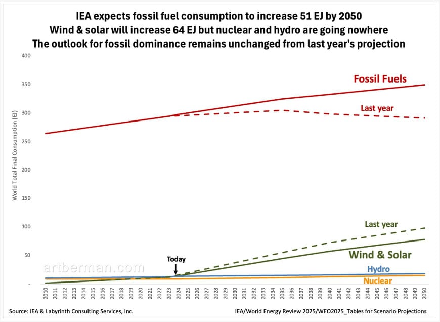 Figure 1. IEA expects fossil fuel consumption to increase 51 EJ by 2050. Wind & solar will increase 64 EJ but nuclear and hydro are going nowhere. The outlook for fossil dominance remains unchanged from last year’s projection. Source: IEA & Labyrinth Consulting Services, Inc. Click on the image to enlarge.