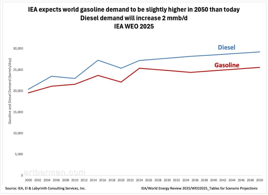 Figure 3. IEA expects world gasoline demand to be slightly higher in 2050 than today. Diesel demand will increase 2 mmb/d. Source: IEA, EI & Labyrinth Consulting Services, Inc. Click on the image to enlarge.