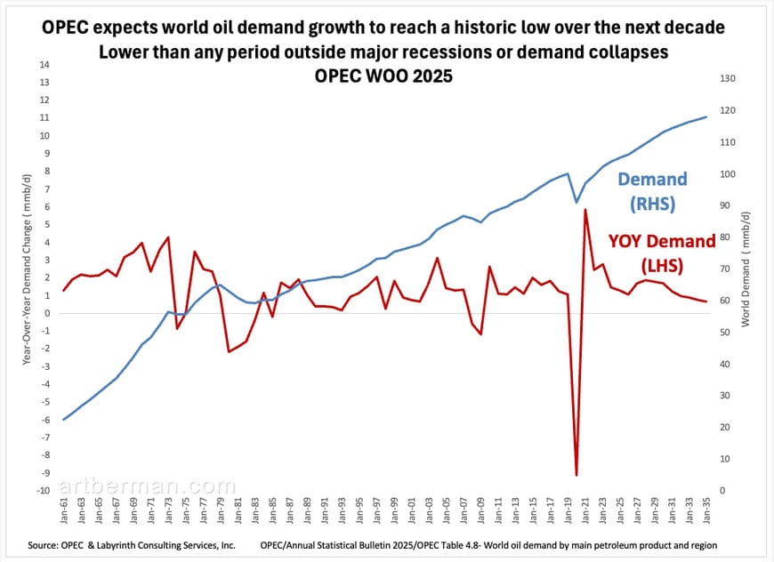 Figure 5. OPEC expects world oil demand growth to a reach historic low over the next decade. Lower than any period outside major recessions or demand collapses (shown using OPEC World Oil Outlook 2025). Source: OPEC & Labyrinth Consulting Services, Inc. Click on the image to enlarge.