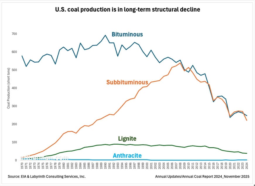 Figure 3. Coal production is in long-term structural decline. Source: EIA & Labyrinth Consulting Services, Inc.