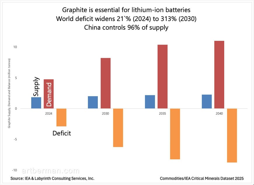Figure 6. Graphite is essential for lithium-ion batteries. World deficit widens 21% (2024) to 313% (2030). China controls 96% of supply. Source: IEA & Labyrinth Consulting Services, Inc. Click on the image to enlarge.