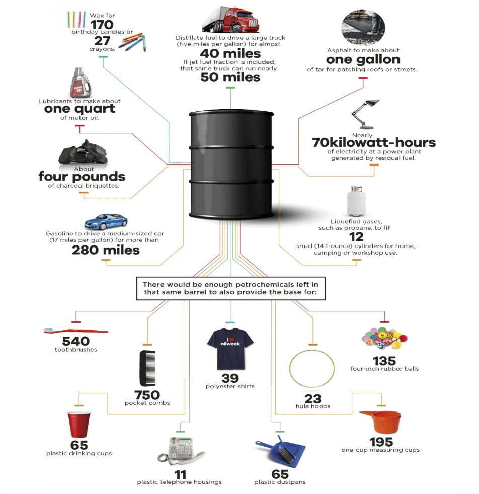 Oil is woven into virtually everything we touch. Only about 40% of a barrel of oil becomes gasoline. The rest is diesel, jet fuel, heating oil, bunker fuel, asphalt, and feedstock for roughly 6,000 other products like medicines, plastics, surgical devices, synthetic clothing, electronics, contact lenses, tents, kayaks, the interior of our cars, and the list goes on.