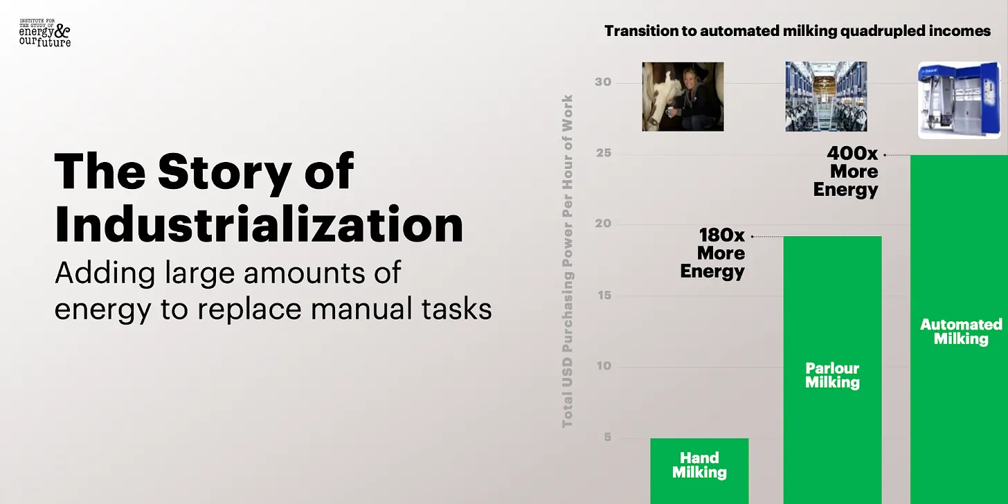 The Industrial Revolution is really the story of adding hundreds or thousands of units of fossil energy to tasks that humans used to do by hand. A dairy farmer manually milking cows was limited to a few dozen animals. Modern industrial dairy applies enormous quantities of diesel, electricity, refrigeration, and transport to the same basic task, producing orders of magnitude more milk at a much lower price and higher profits – but importantly at a very different cost sensitivity.