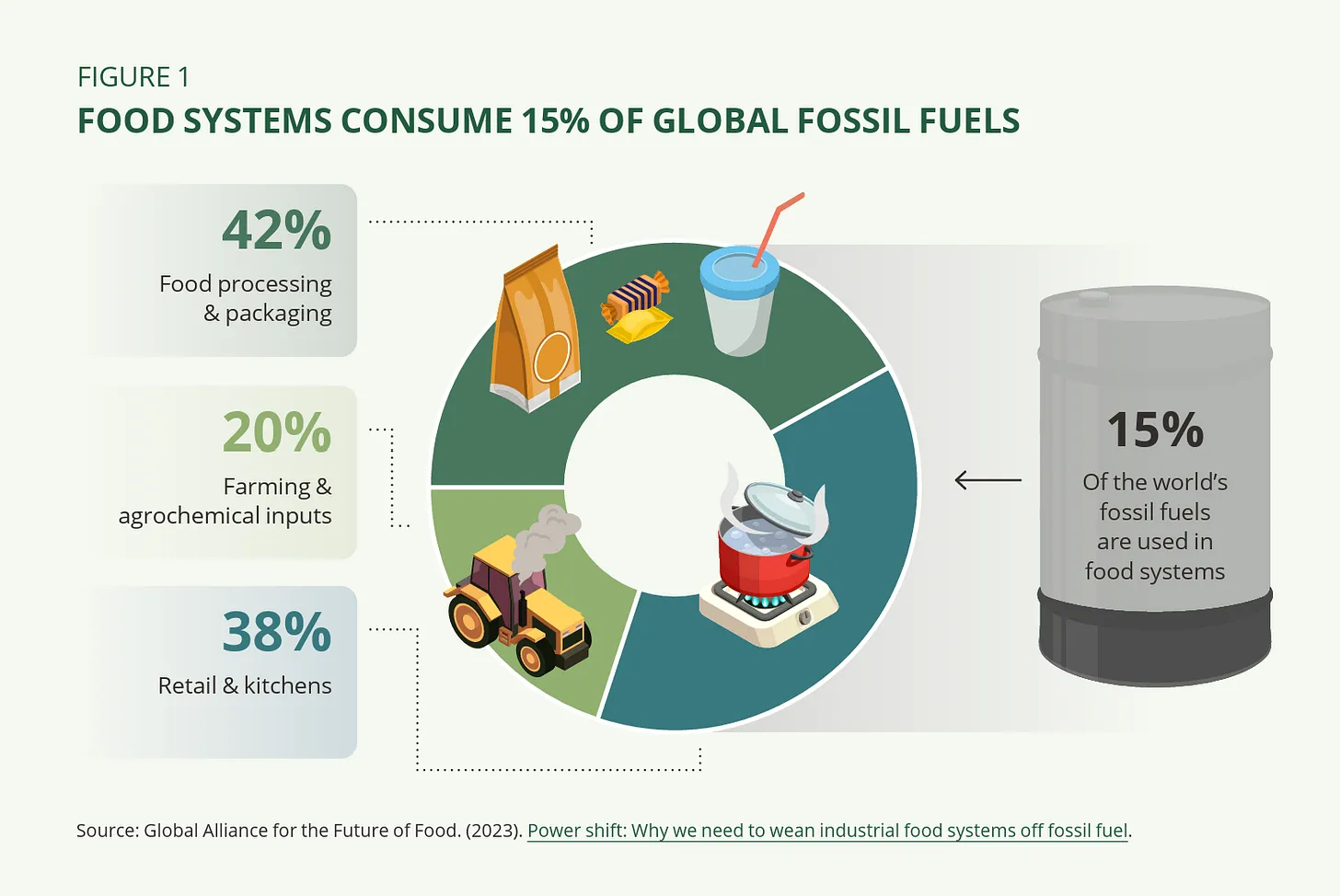 Nowhere is this pattern more consequential than in the thing we all do three times per day: eat. To some people this might sound like an exaggeration, but when we sit down for a meal, what most of us are really eating is processed fossil fuels.